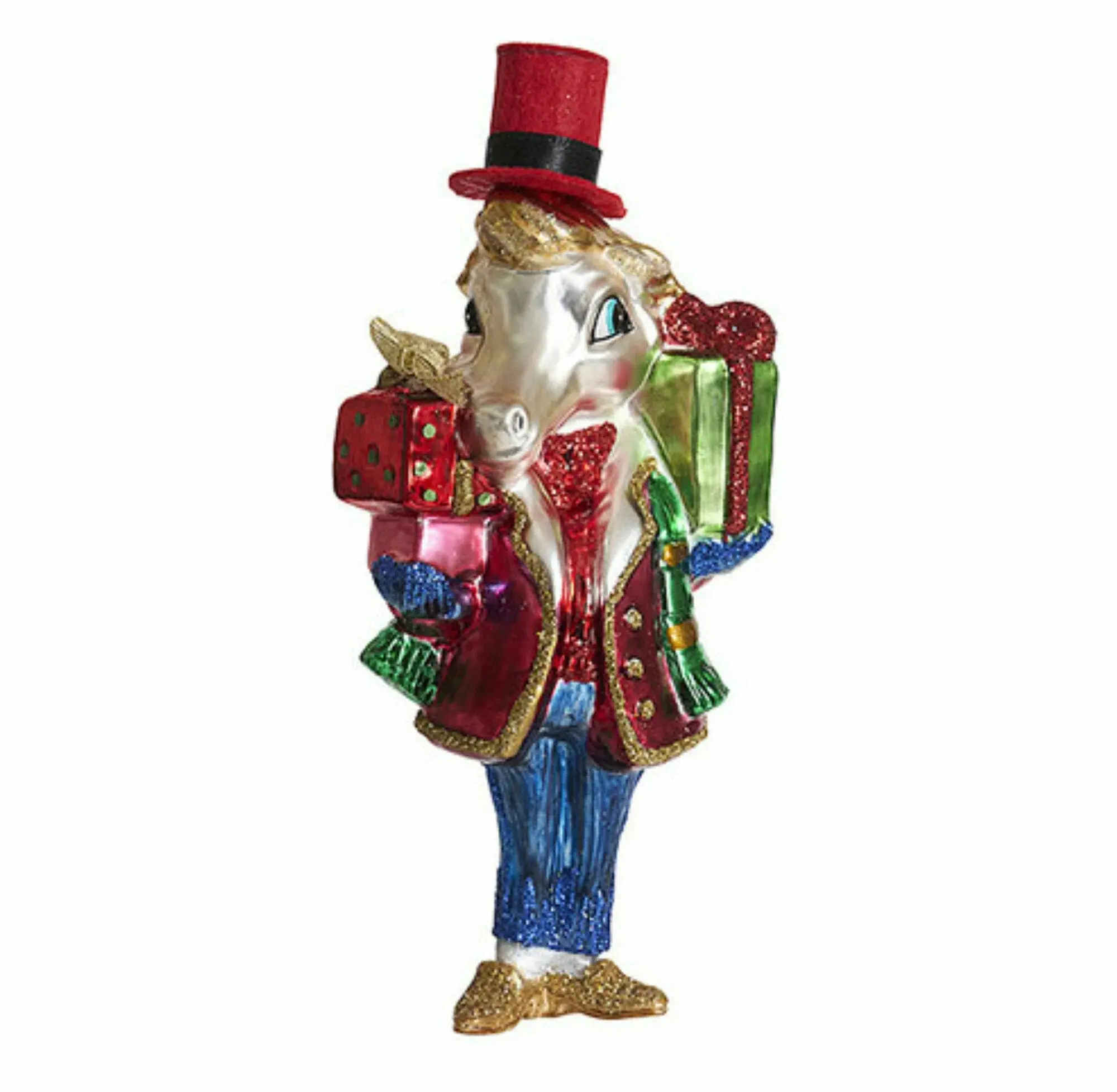Стеклянная ёлочная игрушка конь «Джентльмен с подарками». Размер украшения: 7х5х16 см. Коллекция Holiday Classics. В этой коллекции Вы найдете формовые игрушки в виде снеговиков, Дедов Морозов, птиц, животных, фруктов, часов и других оригинальных предметов. Покупайте ёлочные игрушки для себя и в подарок близким!