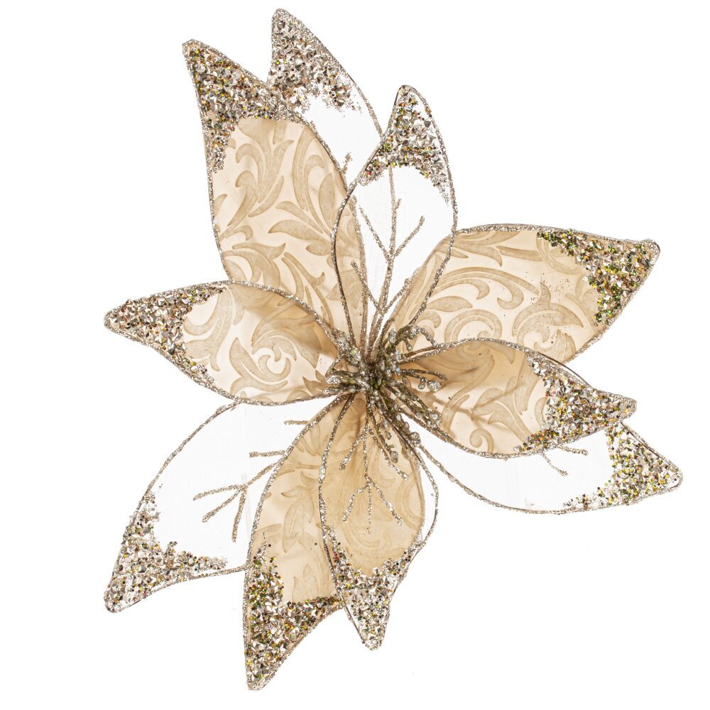 Искусственная пуансеттия смотрится очень волнующе, а усыпанные мелкими блестками лепестки сияют и переливаются от светящихся огоньков новогодней елки.