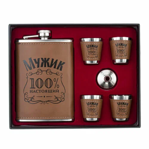 Отличным дополнением в наборе с фляжкой являются 4 рюмки, воронка для удобного переливания жидкостей, упакованы в подарочную коробку. Подарочный набор подойдёт в качестве подарка папе, брату, другу, брату, дедушке на 23 февраля, день рождения или любой другой праздник.