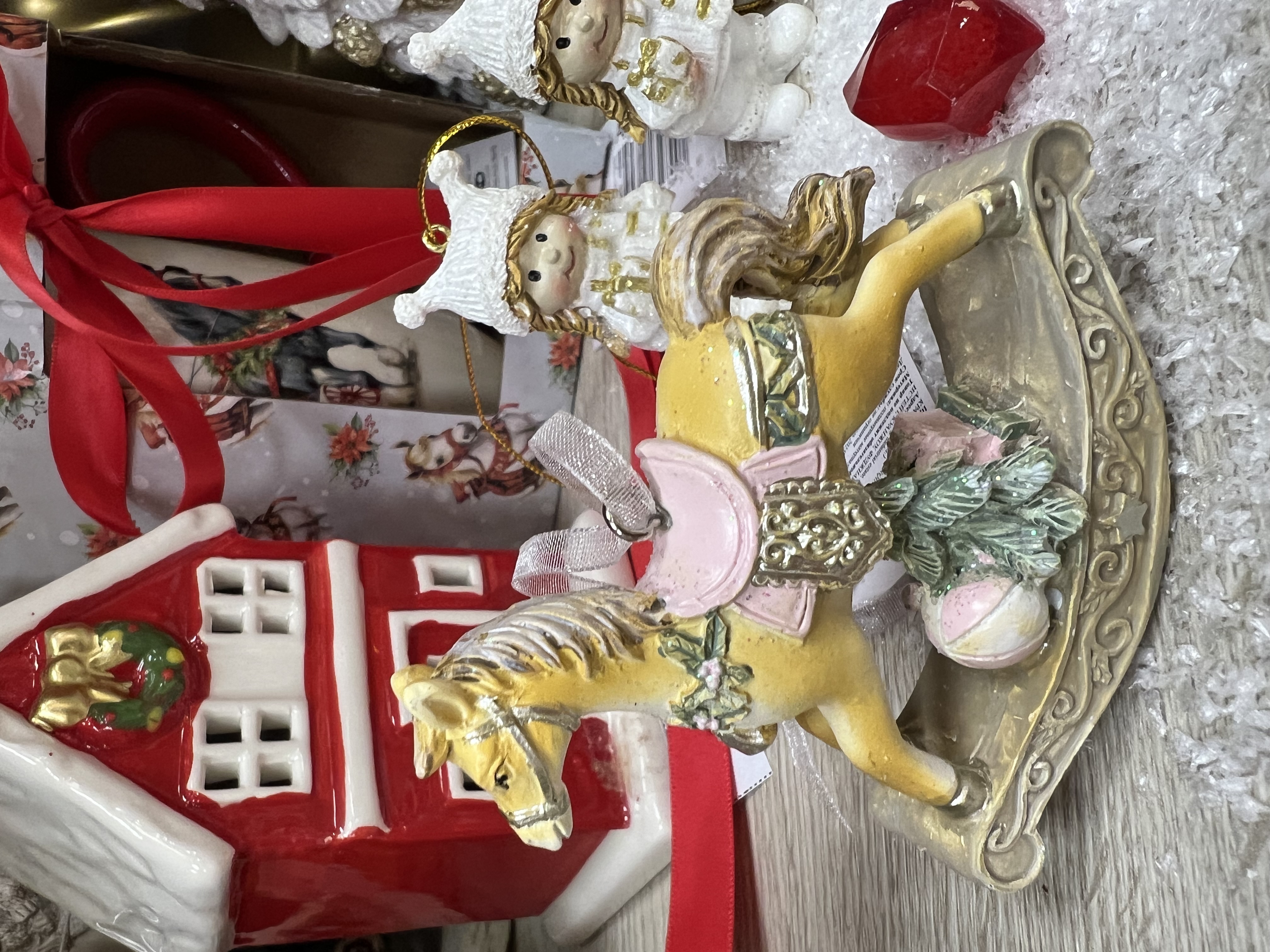 Декоративная новогодняя лошадка-качалка из золотого полимерного материала с глиттером - прекрасное украшение размером 7*2*7,5 см. Ее блестящий вид и изящный дизайн придадут праздничное настроение и уют вашему интерьеру. Подвеска для удобного размещения поможет вам создать волшебную новогоднюю атмосферу в доме.