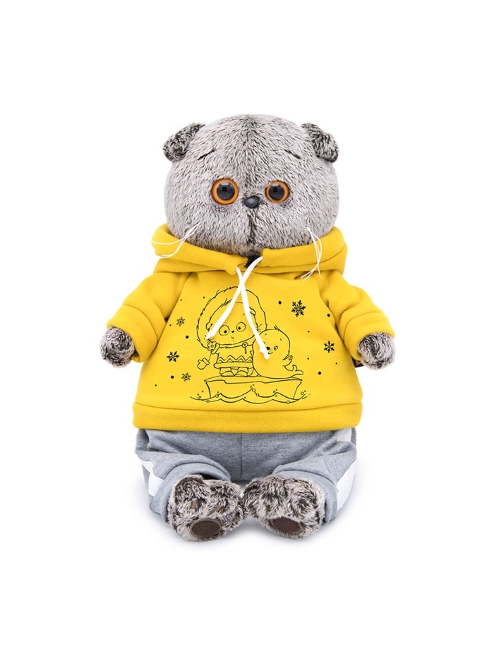 Кот Басик одет в жёлтую толстовку с капюшоном и декоративным принтом, а также серые спортивные штаны. Одежда аккуратно сидит и дополняет его уютный и современный образ. Продуманные детали и гармоничное сочетание цветов делают игрушку особенно привлекательной.